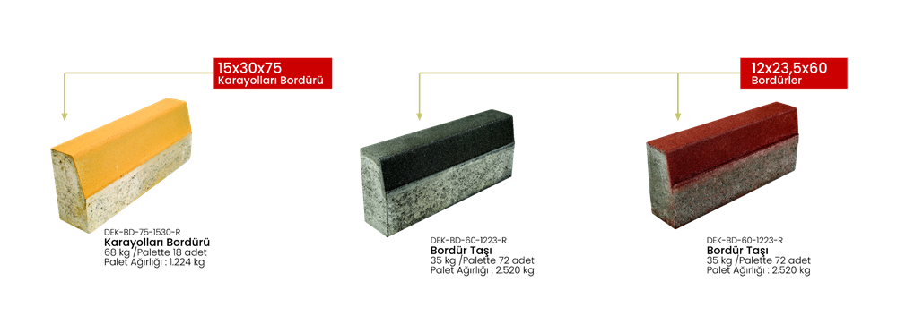 Bordürler Alalika markası ile naturel ve boyalı yüzey, Aladeco markası ile mineral, kumlamalı ve yıkamalı yüzey seçenekleriyle üretilmektedir. Projenize uygun bordür seçimi için lütfen satış danışmanımız ile iletişime geçiniz.
